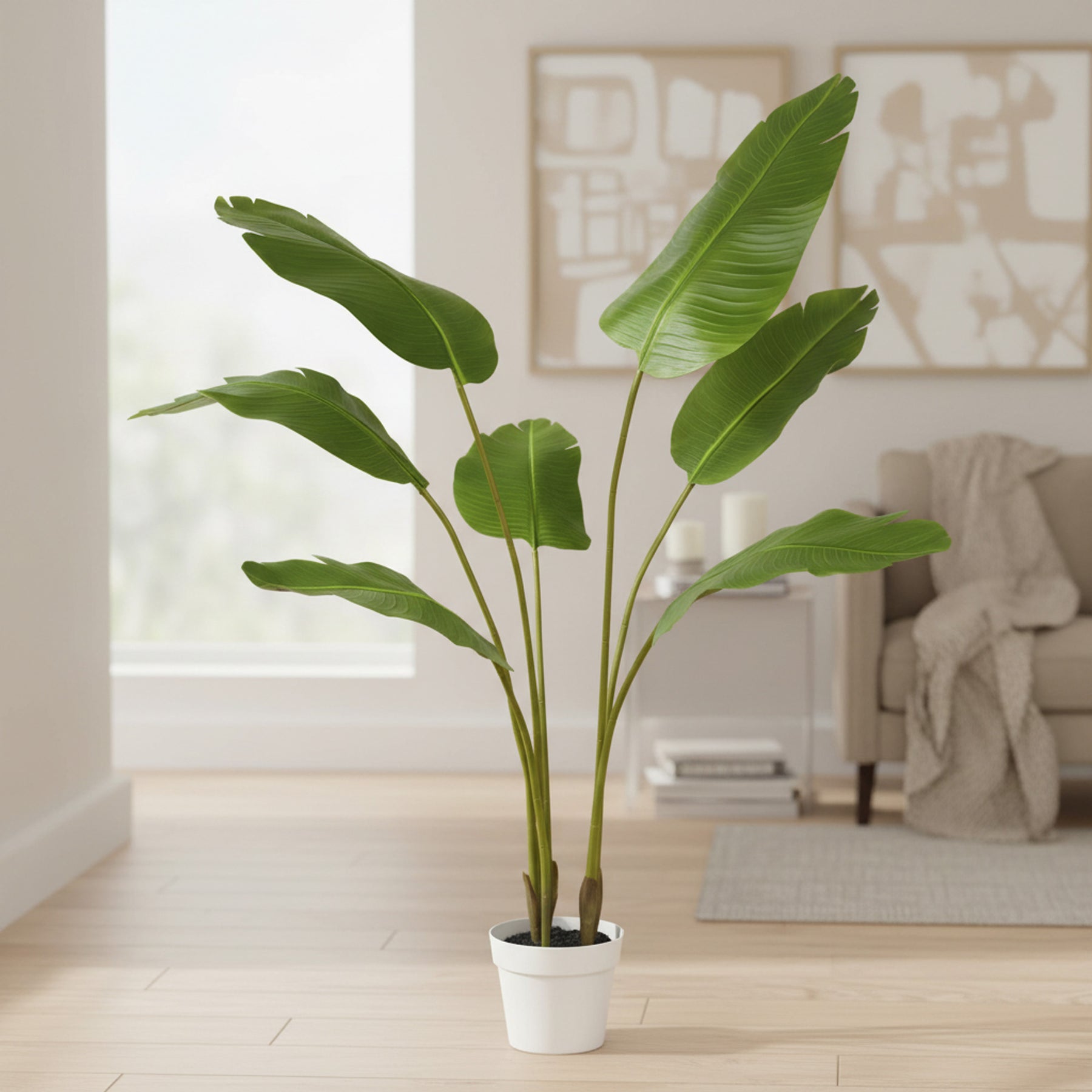 Each leaf is shaped with gentle curvature, fine linear ribbing, and soft tonal variation that echoes the beauty of living banana-style palms. The multi-stem trunk includes authentic color transitions and cane-style nodes, while the white planter and faux soil create a polished, ready-to-display presentation.